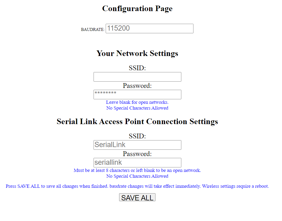 In the configuration Page you have 5 modifiable values, These are Baud Rate, your network ssid, your network password, device SSID, and device password, along with the save button of course.